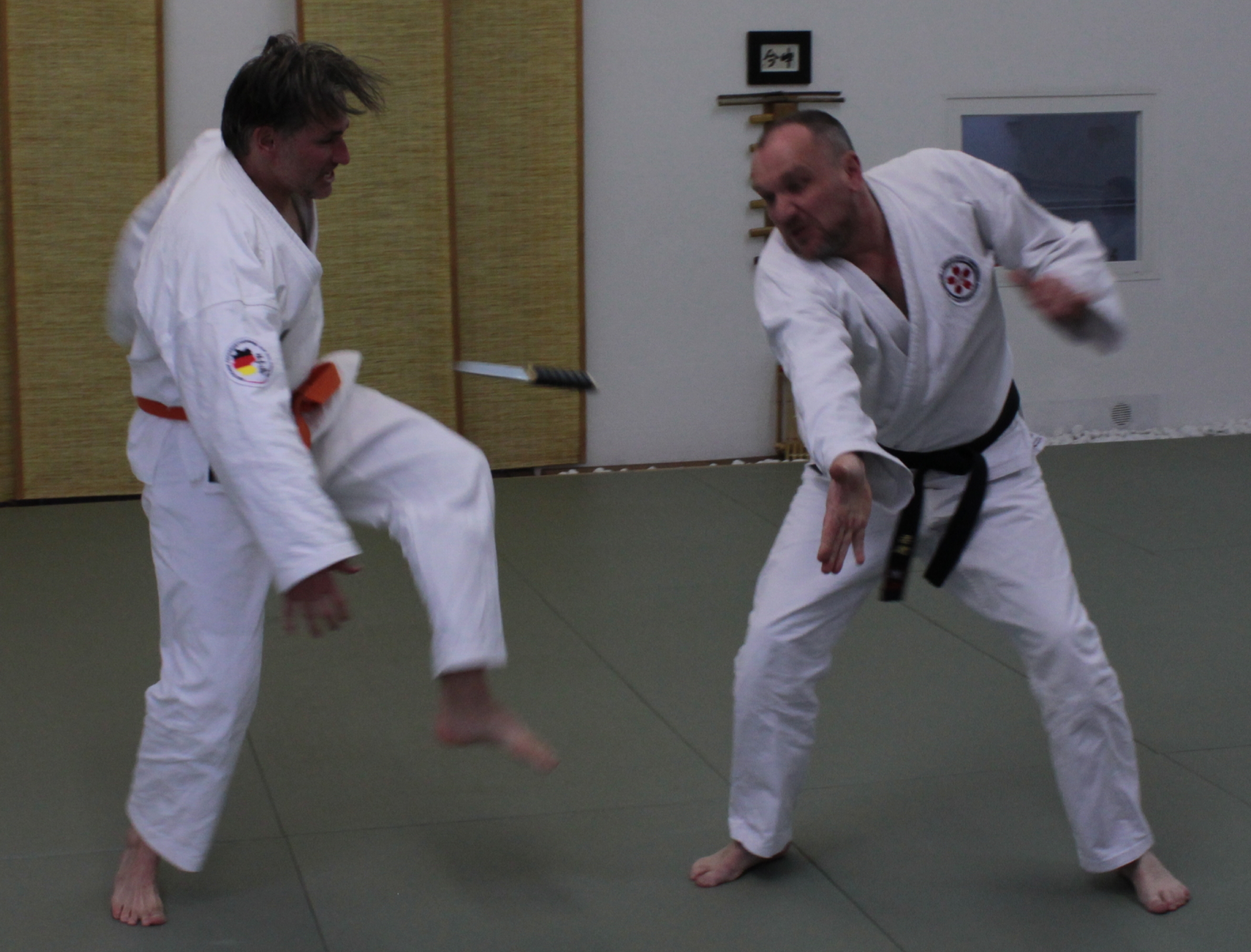 Danach musste jeder Prüfling die für seine angestrebte Graduierung benötigte Selbstverteidigung ohne und mit Waffen einzeln präsentieren.