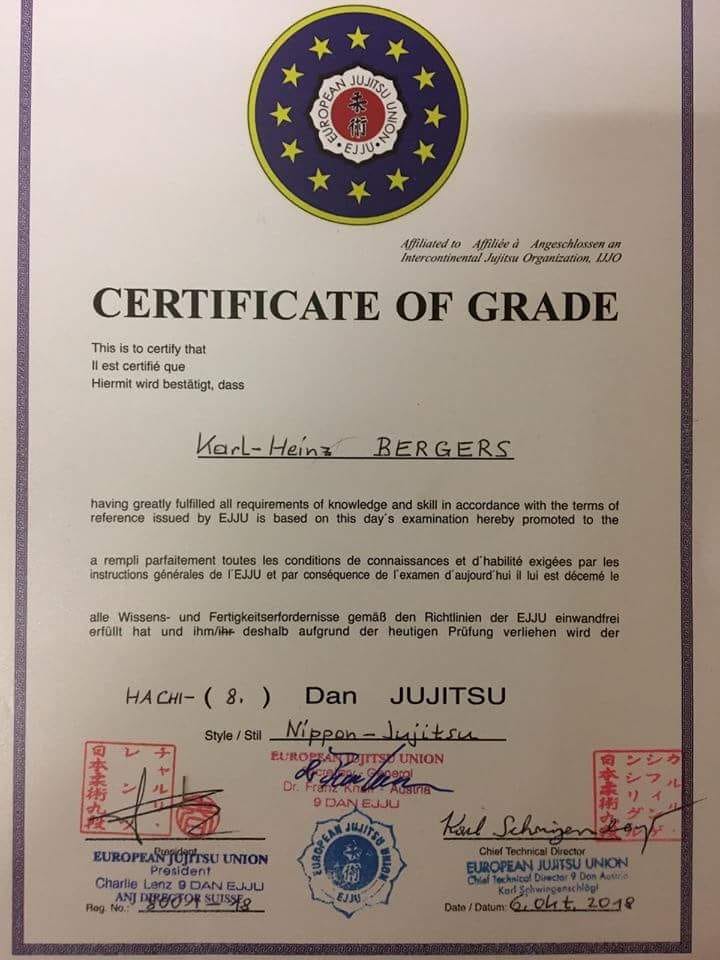 Er nahm noch einige Ehrungen im Namen der EJJU vor, so freuten sich die Anwesenden unseres Dojo’s ganz besonders über die Ehrung vor Matthias Kramer zum 2. Dan und sogar noch mehr über die Ehrung unseres Sensei’s Karl-Heinz Bergers zum 8. Dan (Hanshi).