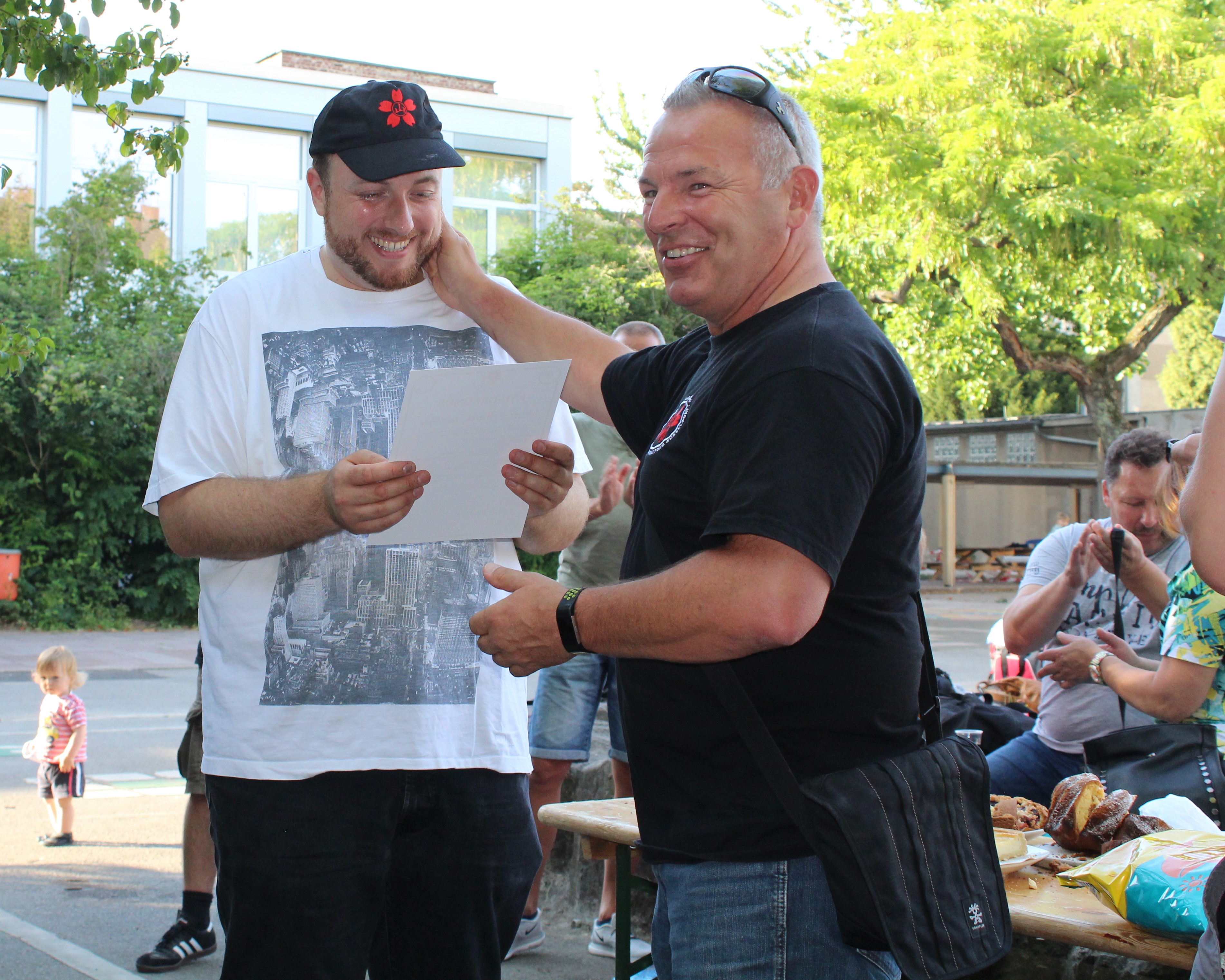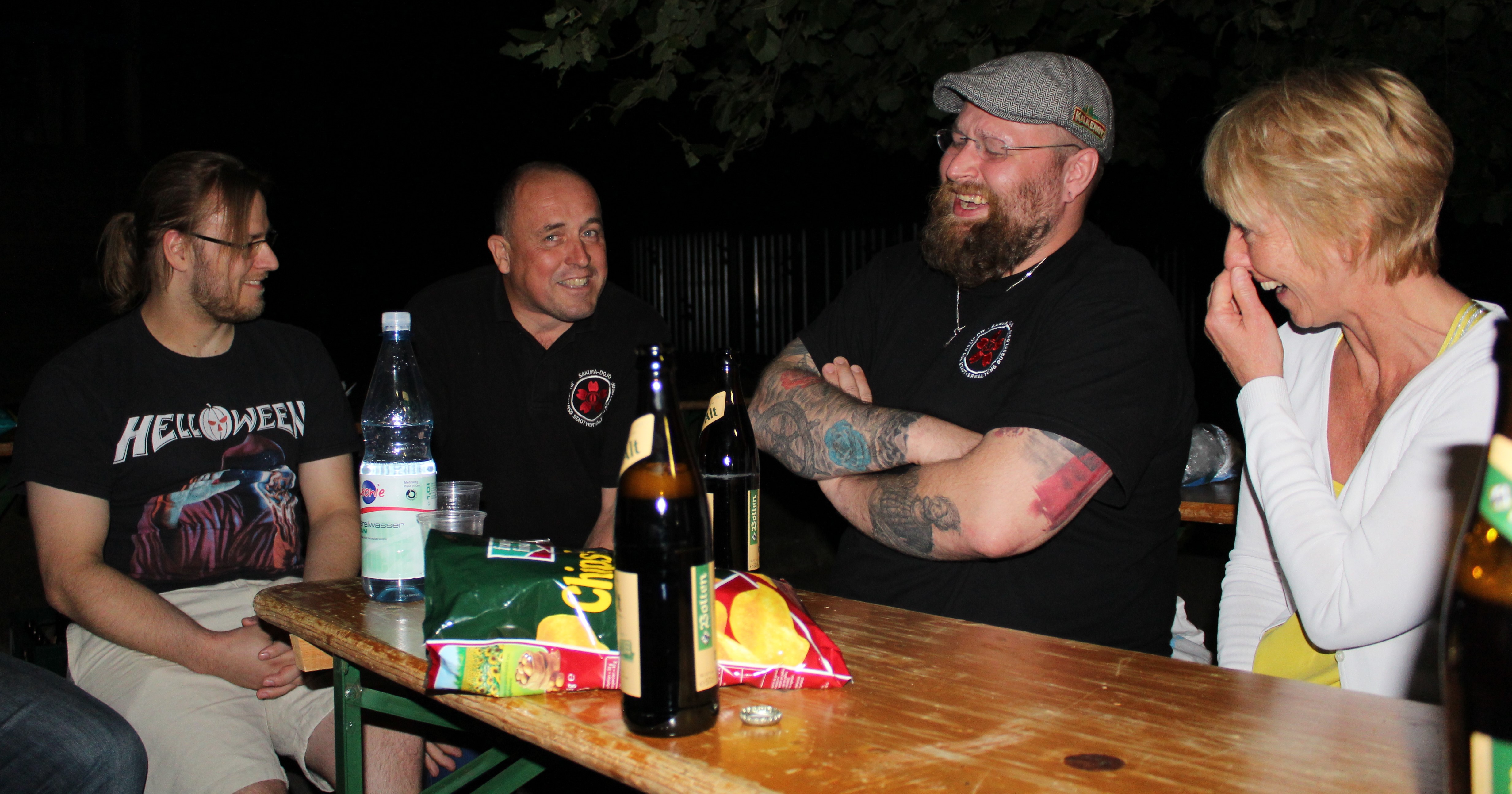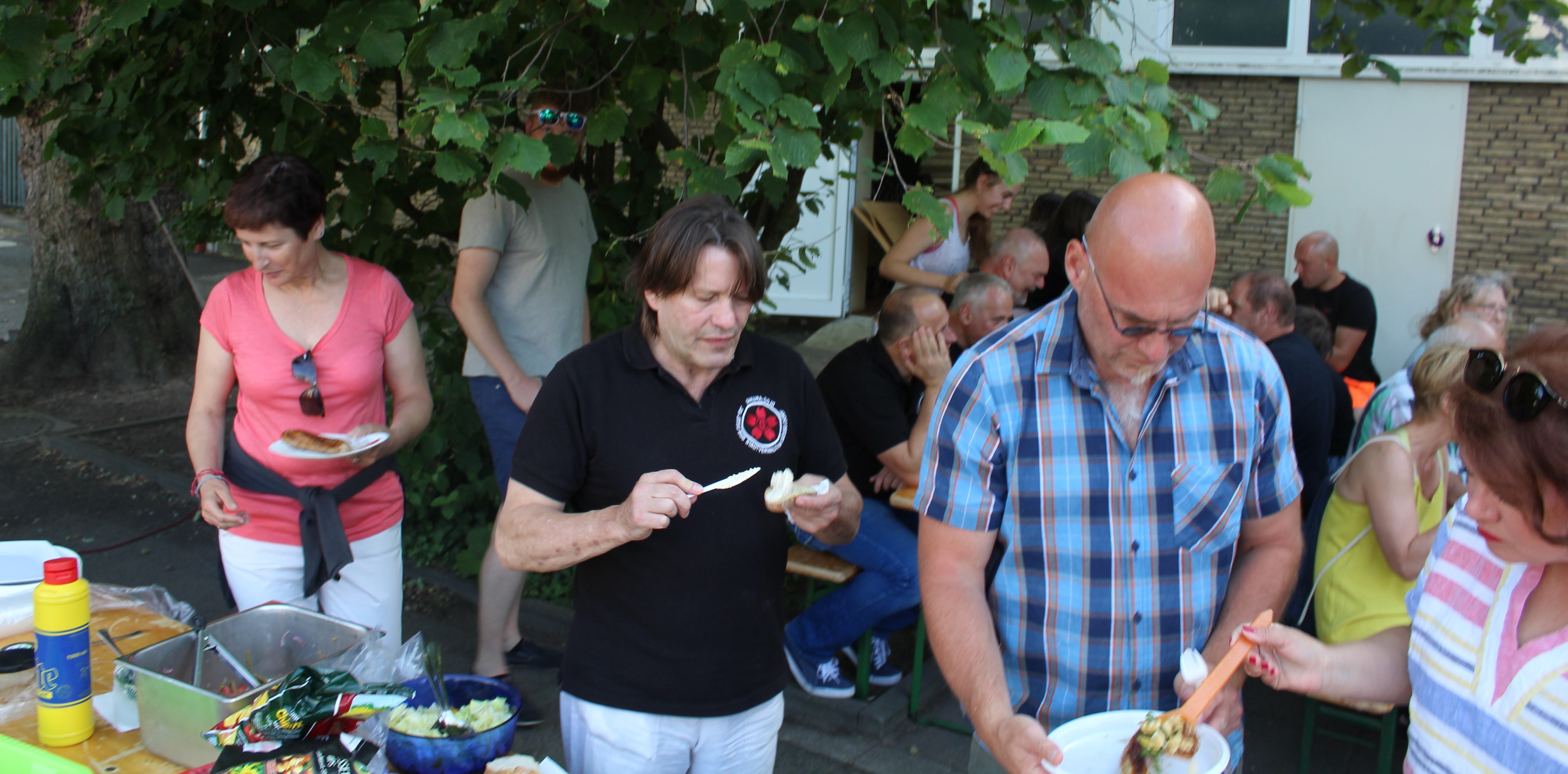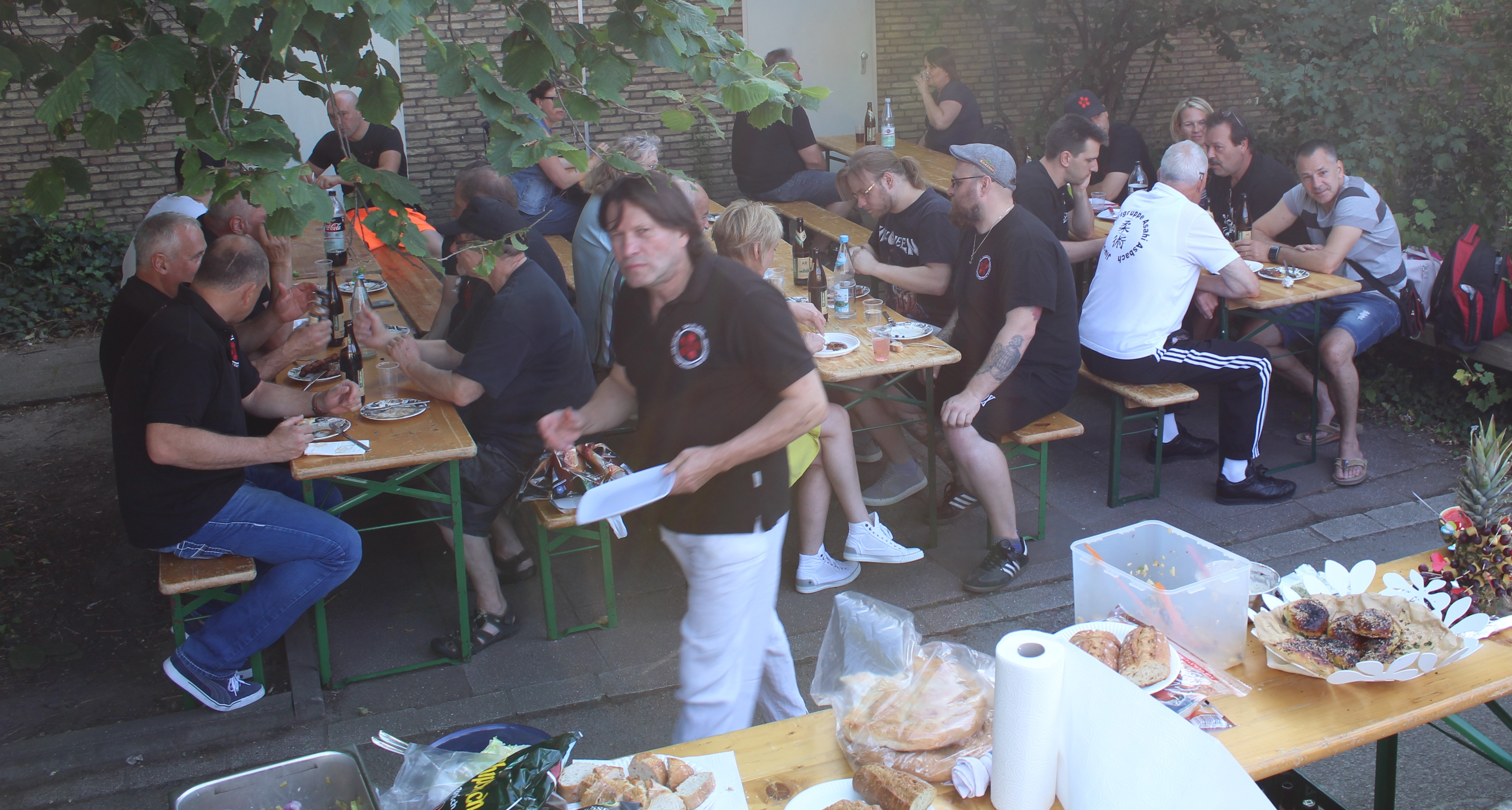 Nach weiteren vier Stunden intensivem Training lud dann das Sakura-Dojo seine Mitglieder, Freunde und Verwandte zum Sommerfest ein. Hier zeigte sich wieder einmal, dass die Mitglieder des Vereins nicht nur gut und gerne Feiern sondern auch, dass durch den Zusammenhalt und die Einsatzbereitschaft aller viele Dinge umgesetzt werden können. Jeder erklärte sich gerne bereit, einen Kuchen zu backen, Brot, Getränke, Fleisch und anderes zu besorgen, aber auch durch tatkräftige Unterstützung beim Auf- und Abbau behilflich zu sein. So endete dann ein rundum gelungener Sporttag in einer schönen, harmonischen Runde bei leckerem Essen und kühlen Getränken.