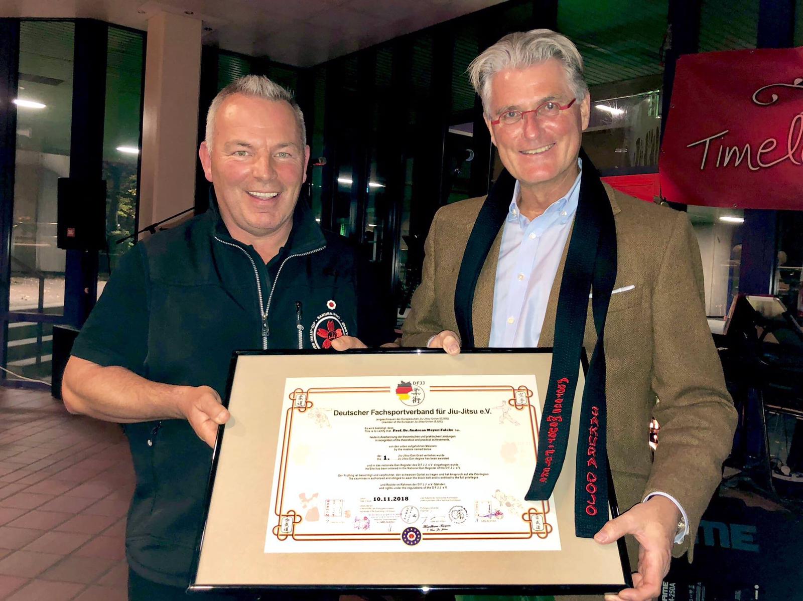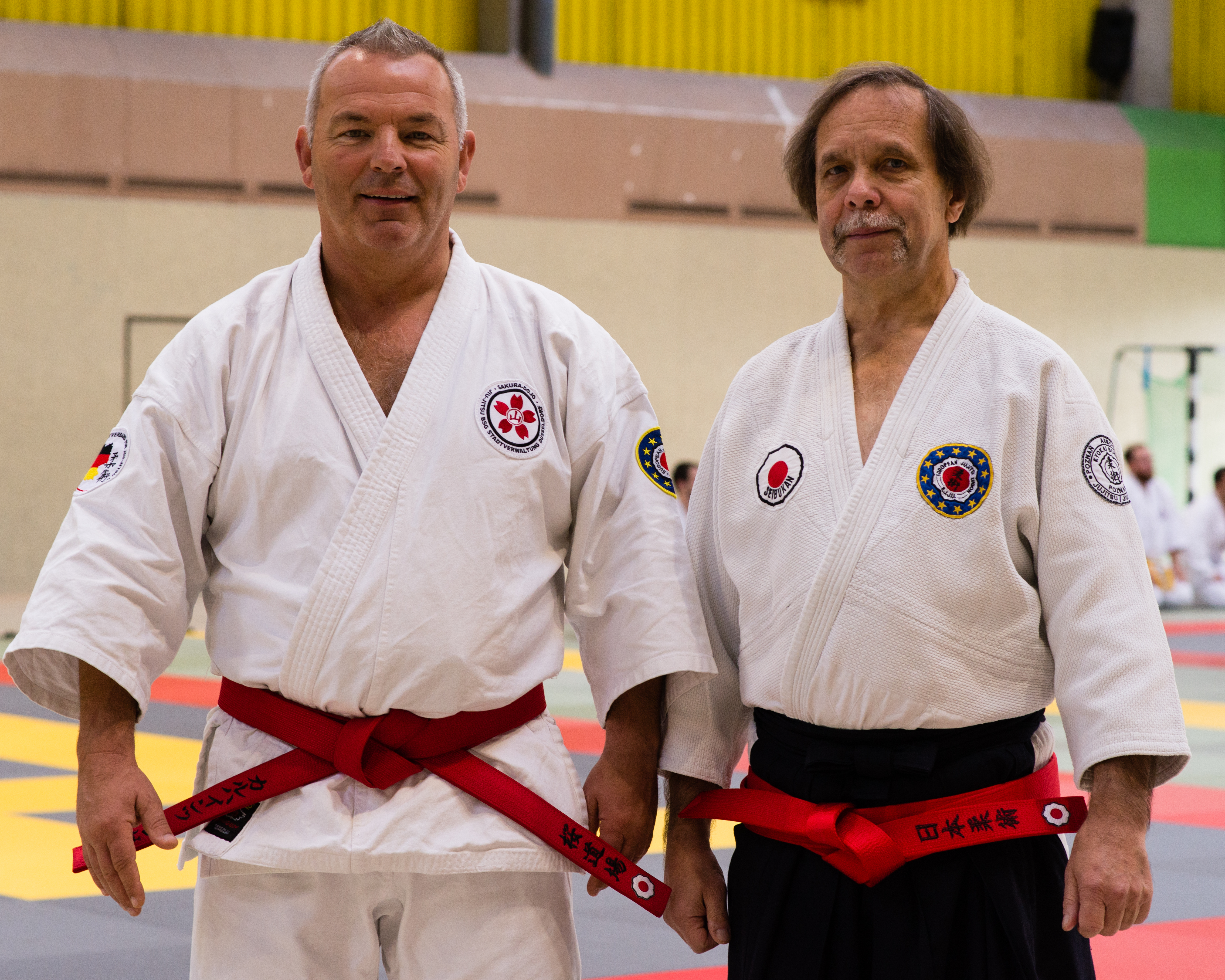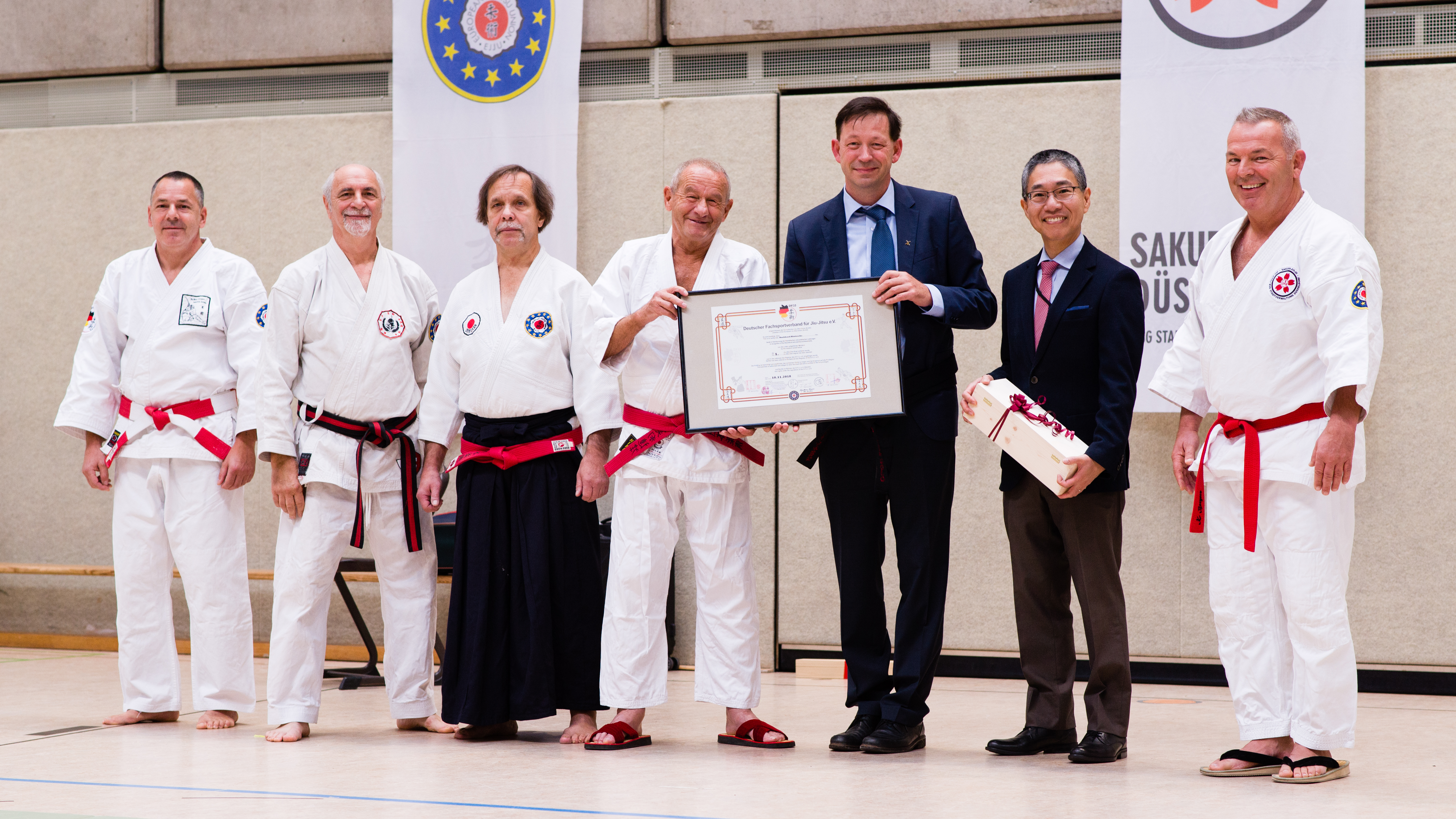 Pünktlich um 11:00 Uhr eröffnete Konsul Shinsuke Toda aus dem Japanischen Generalkonsulat und der Düsseldorfer Stadtdirektor und Sportdezernent Burkhard Hintzsche, welcher seit drei Jahren die Schirmherrschaft des Lehrgangs übernommen hat, mit Grußworten die Veranstaltung. Bevor es allerdings auf die Tatami ging standen noch einige Überraschungen an, als erstes wurde Burkhard Hintzsche, welcher bereits seit mehreren Jahren Ehrenmitglied im Sakura-Dojo ist, der 1. Dan verliehen. Im Anschluss wurde dann Kalla Bergers selber überrascht, auf Formentera zum Hanshi mit dem 8. Dan ausgezeichnet, hat es sich der Vorstand des DFJJ e.V. nicht nehmen lassen ihm einen roten, handgefertigten japanischen Seiden-Obi zu überreichen. Außerdem wurde dann durch den Präsidenten des DFJJ e.V. unser langjähriger Freund auf und neben der Tatami Krzysztof Staniszewski mit einem entsprechenden Seiden-Obi überrascht.