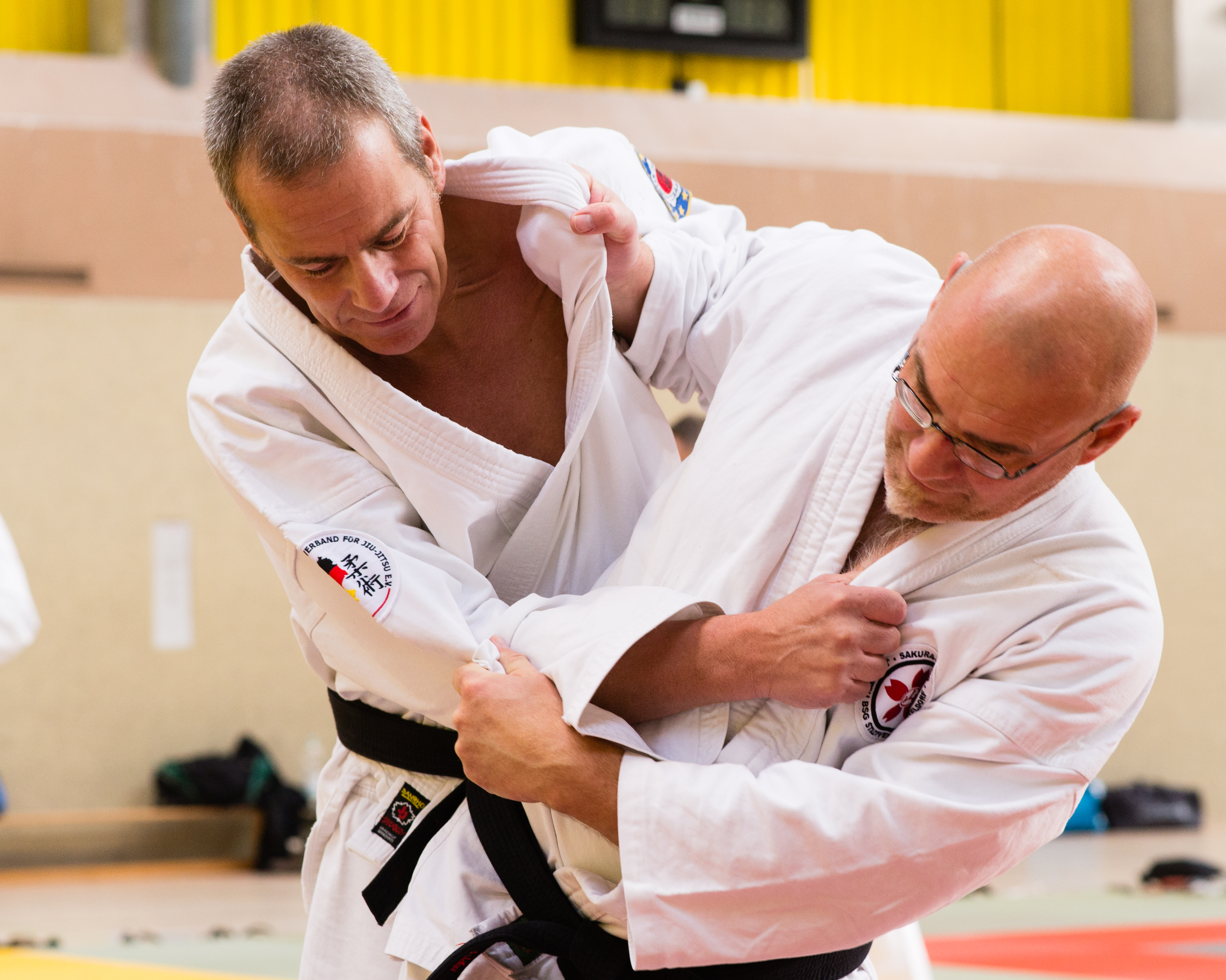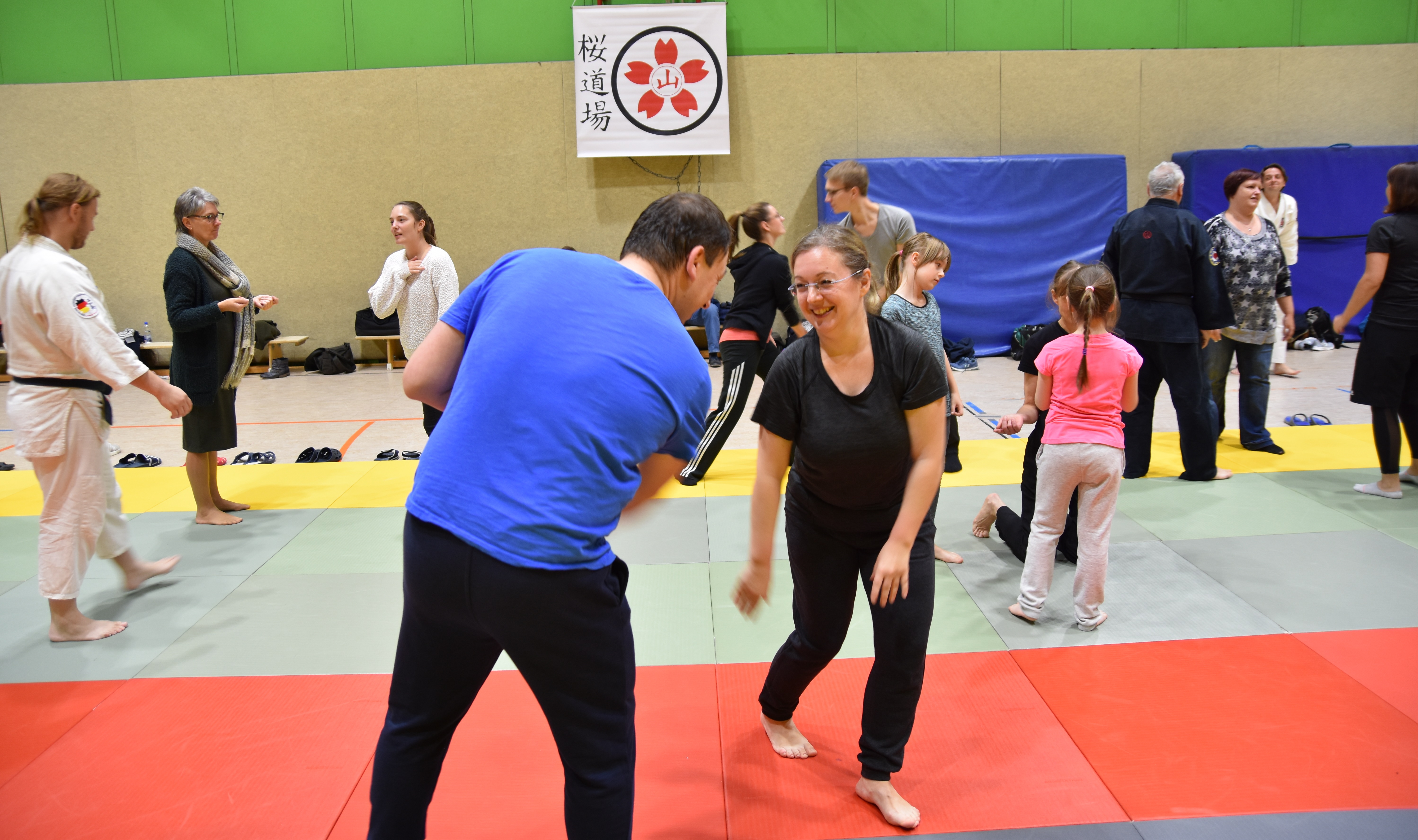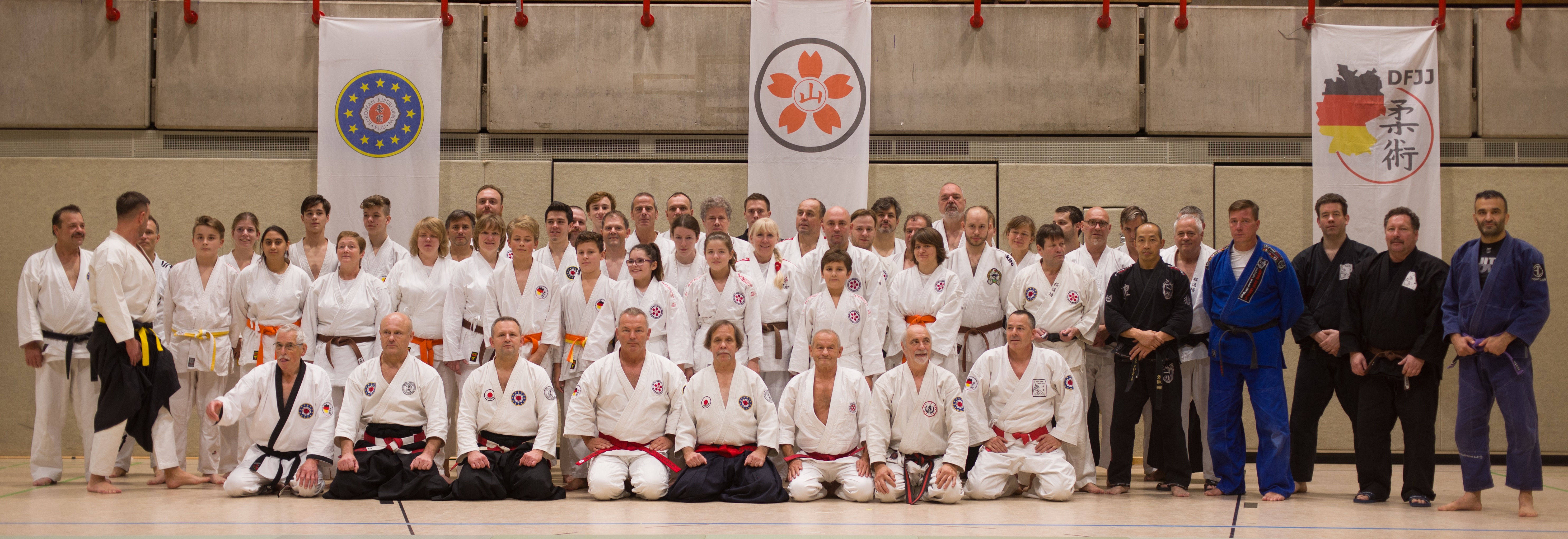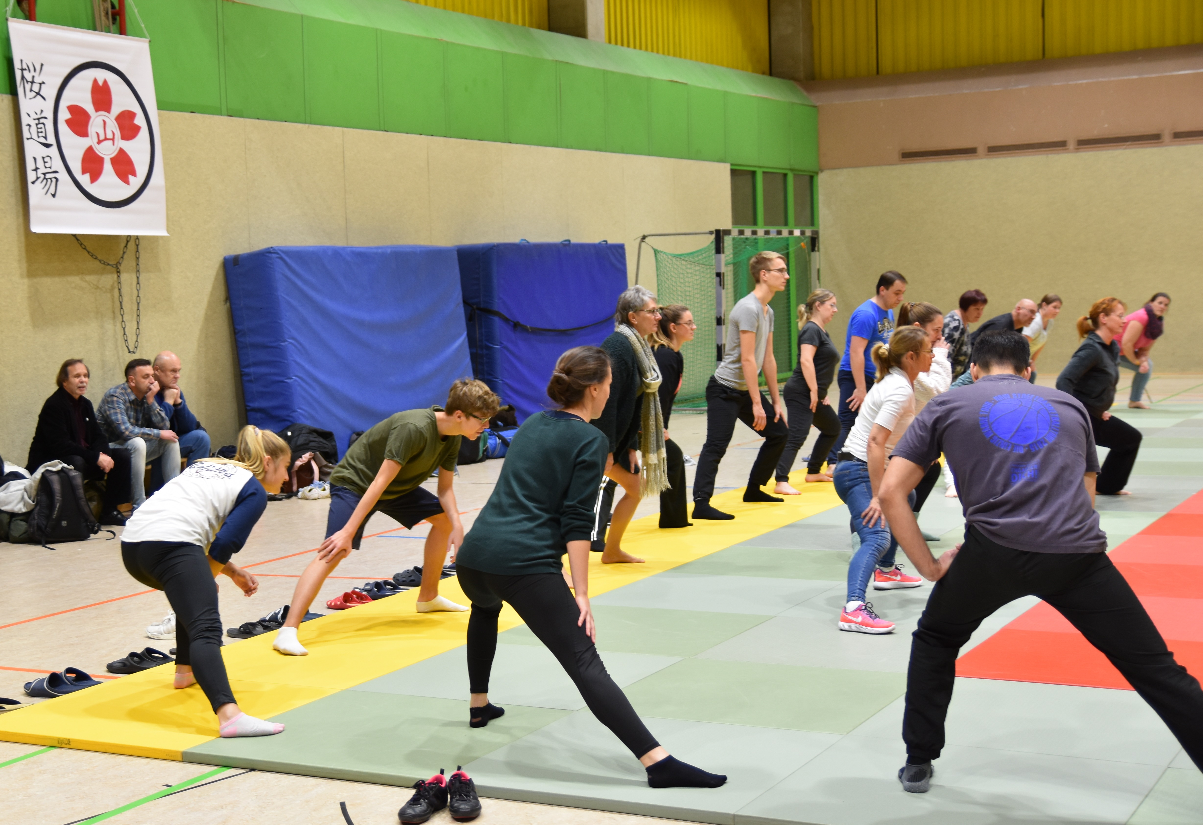 Vom 09. bis 11. November 2018 war es wieder soweit, das Sakura-Dojo lud bereits zum dreizehnten Mal zum internationalen Lehrgang der EJJU ein. Am frühen Freitagabend, die Tatami war bereits vollständig vorbereitet, fanden sich knapp dreißig Teilnehmer zum Workshop für Interessierte und nicht Budosportler ein. Unter Anleitung von Kalla Bergers und seinem Team erlernten diese kurze und effektive Techniken um sich in Gefahrensituationen zur Wehr setzen zu können. Zum Ende des Workshops hatten die Teilnehmer dann auch noch die Möglichkeitsich bei einem Angriff realistisch zu wehren, ein Meisterschüler musste in einen professionellen Schutzanzug einige Schläge und Tritte erleiden. Trotz der Ernsthaftigkeit des Themas bleib der Spaß nicht auf der Strecke, was die Bilder eindeutig beweisen.