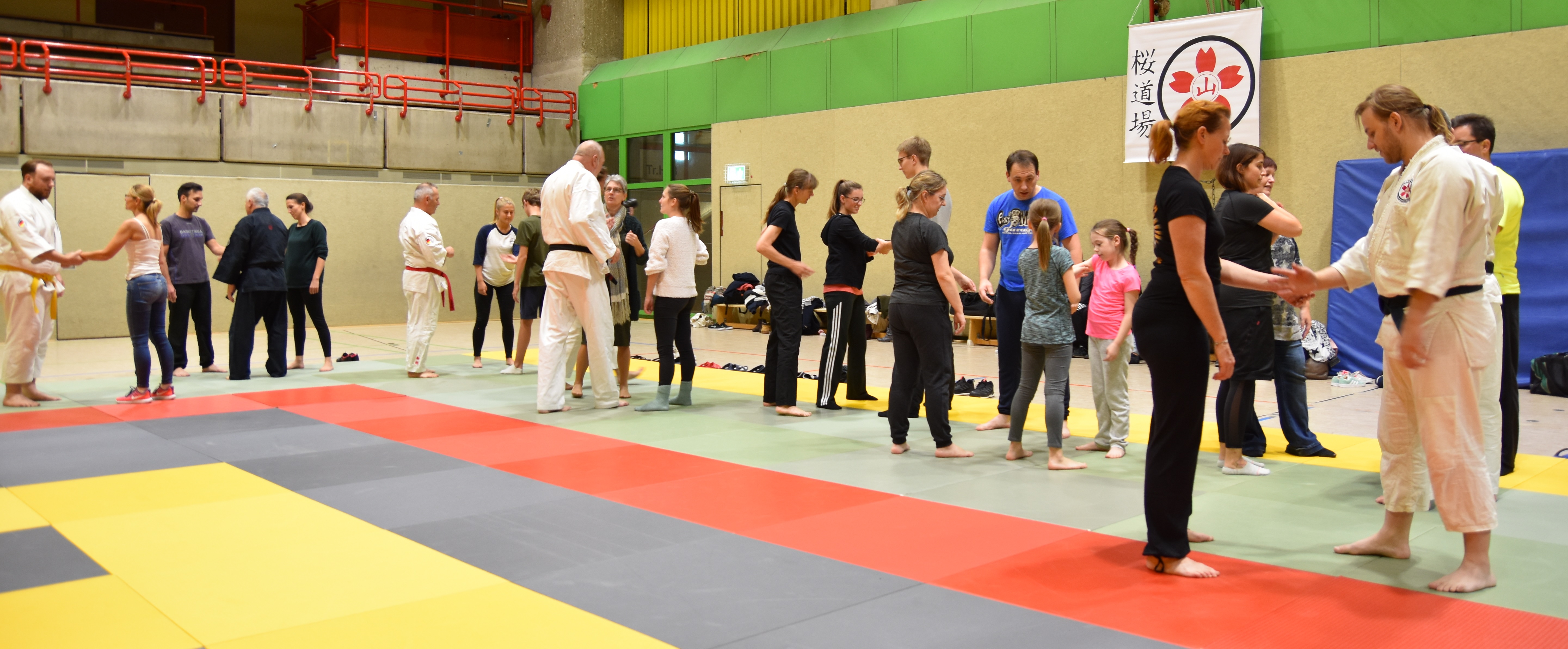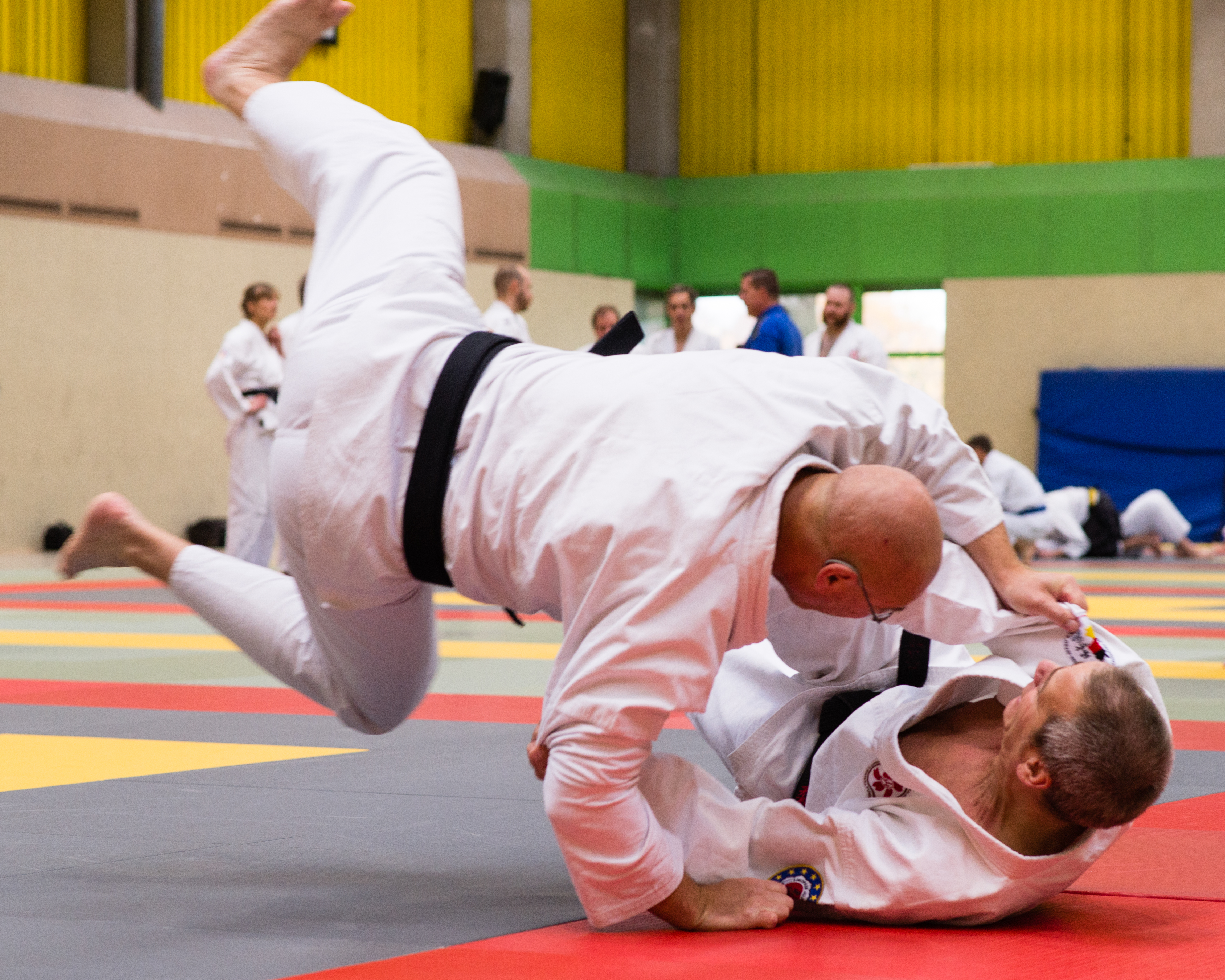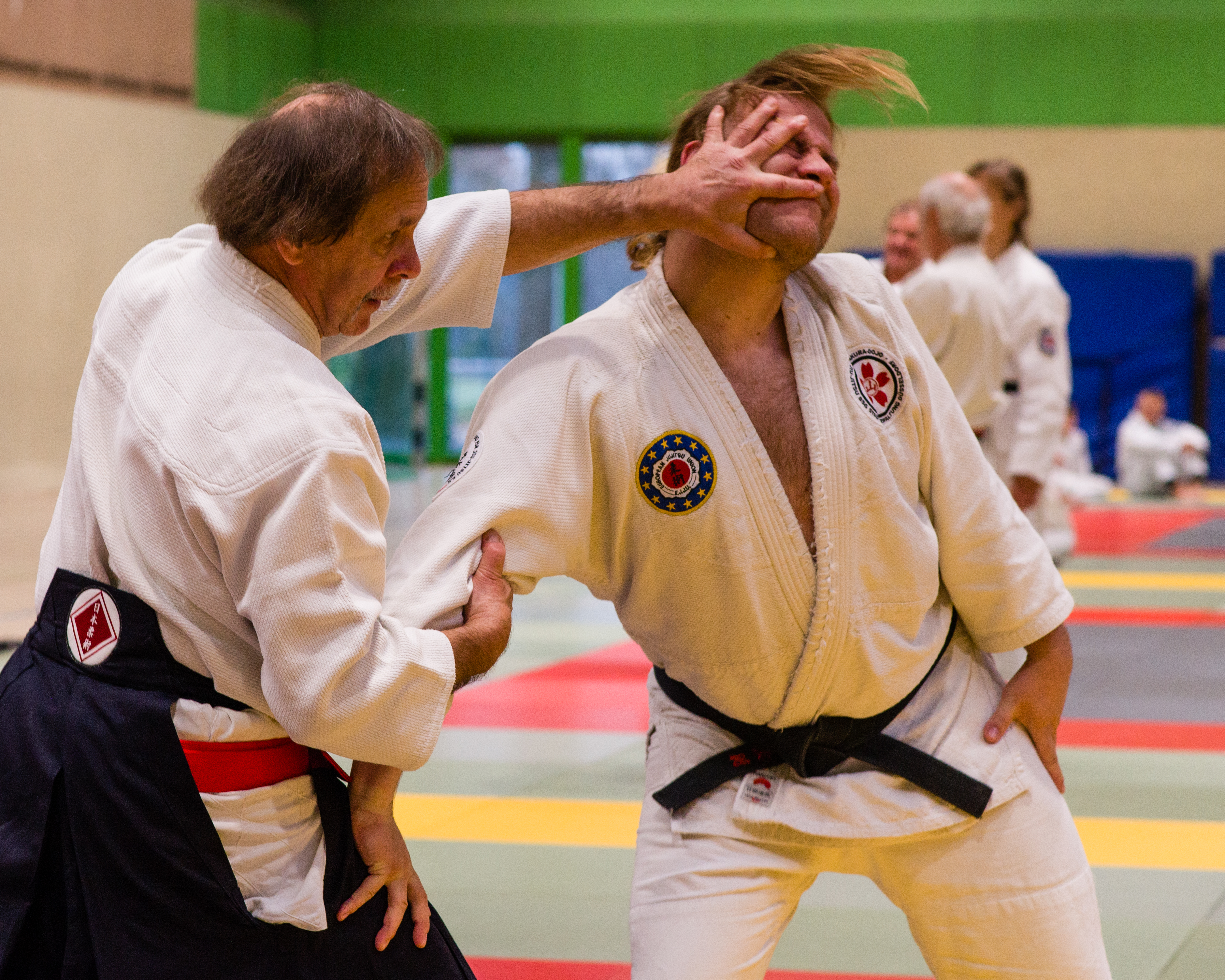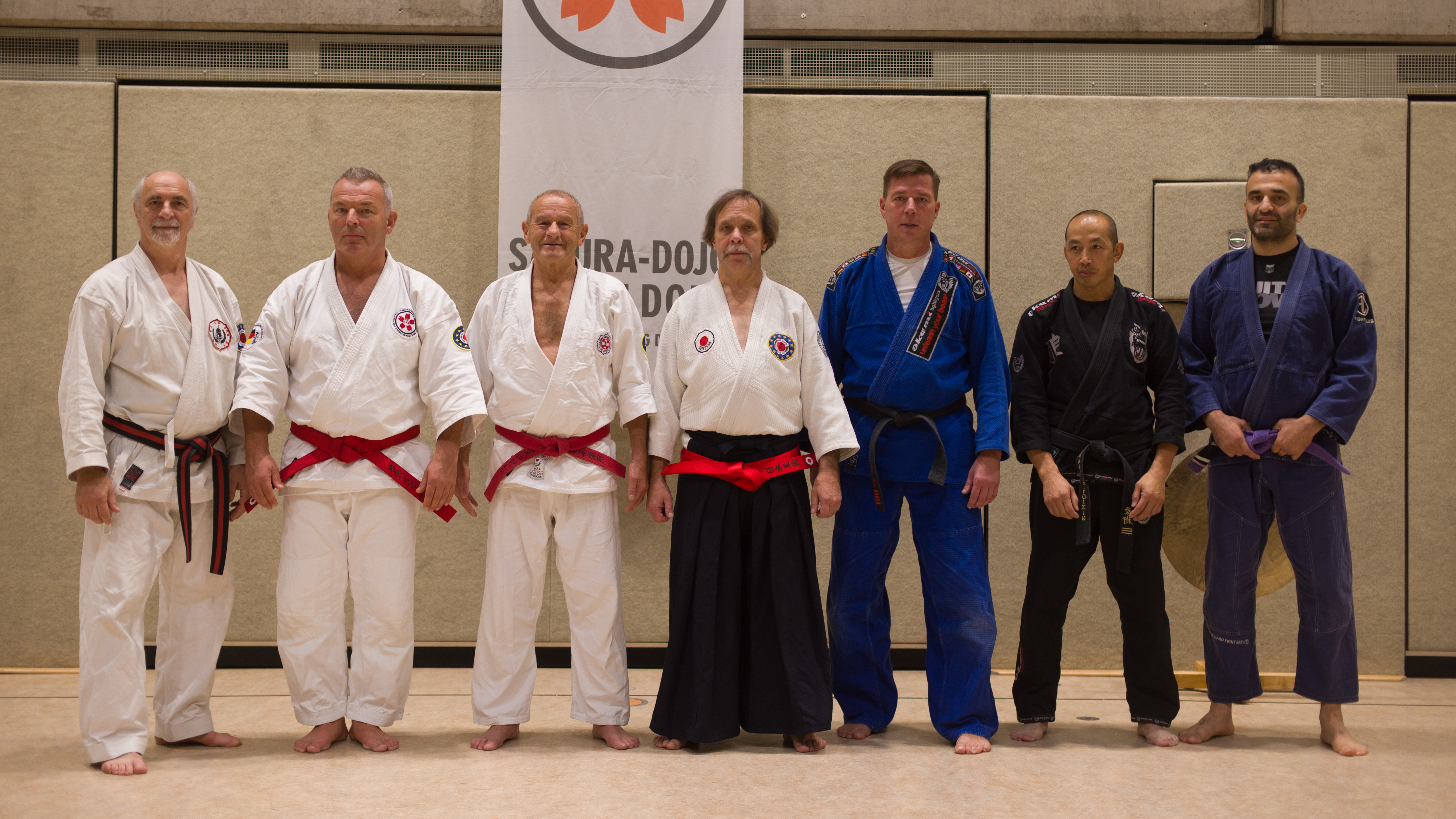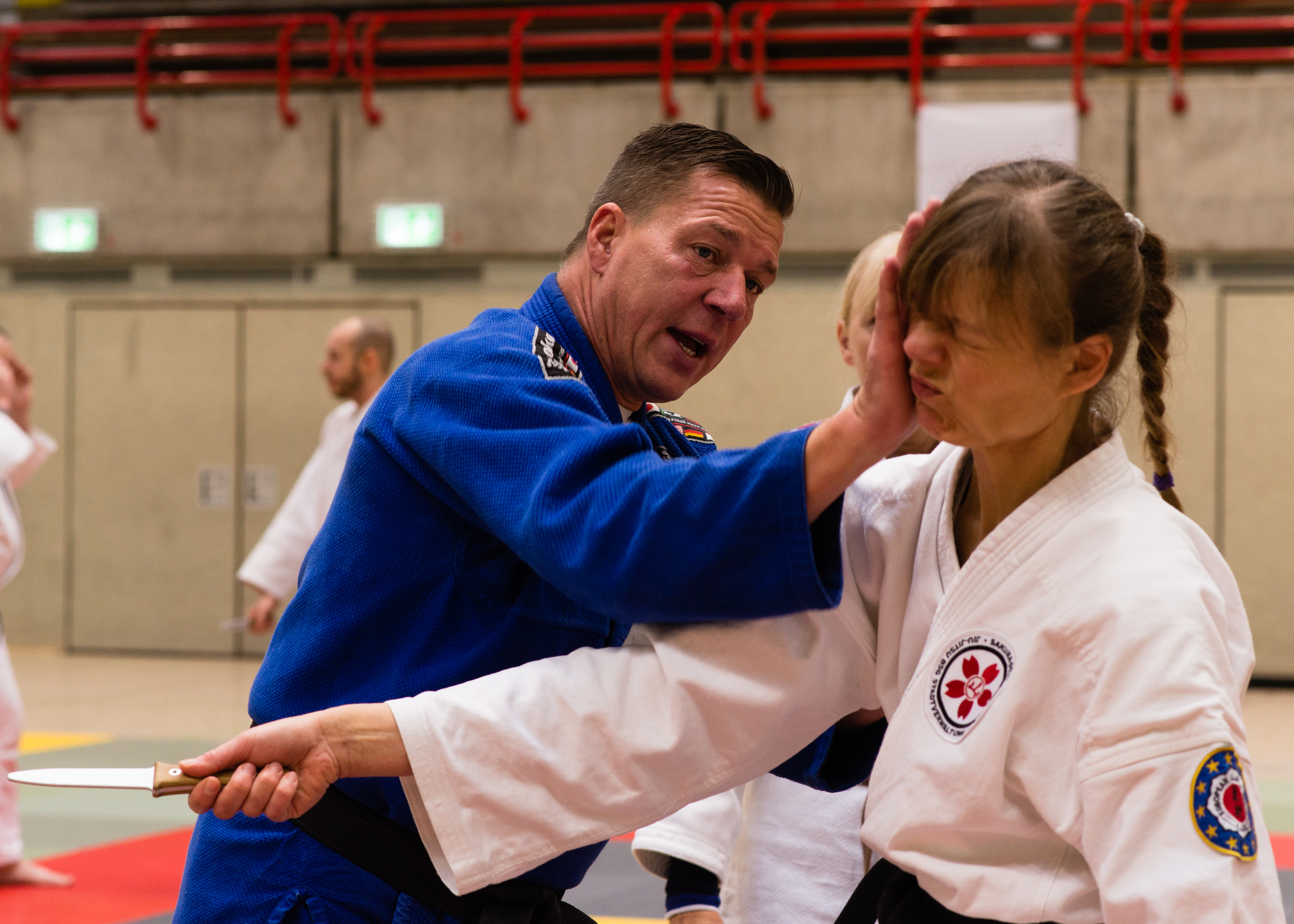 Vom 09. bis 11. November 2018 war es wieder soweit, das Sakura-Dojo lud bereits zum dreizehnten Mal zum internationalen Lehrgang der EJJU ein. Am frühen Freitagabend, die Tatami war bereits vollständig vorbereitet, fanden sich knapp dreißig Teilnehmer zum Workshop für Interessierte und nicht Budosportler ein. Unter Anleitung von Kalla Bergers und seinem Team erlernten diese kurze und effektive Techniken um sich in Gefahrensituationen zur Wehr setzen zu können. Zum Ende des Workshops hatten die Teilnehmer dann auch noch die Möglichkeitsich bei einem Angriff realistisch zu wehren, ein Meisterschüler musste in einen professionellen Schutzanzug einige Schläge und Tritte erleiden. Trotz der Ernsthaftigkeit des Themas bleib der Spaß nicht auf der Strecke, was die Bilder eindeutig beweisen.