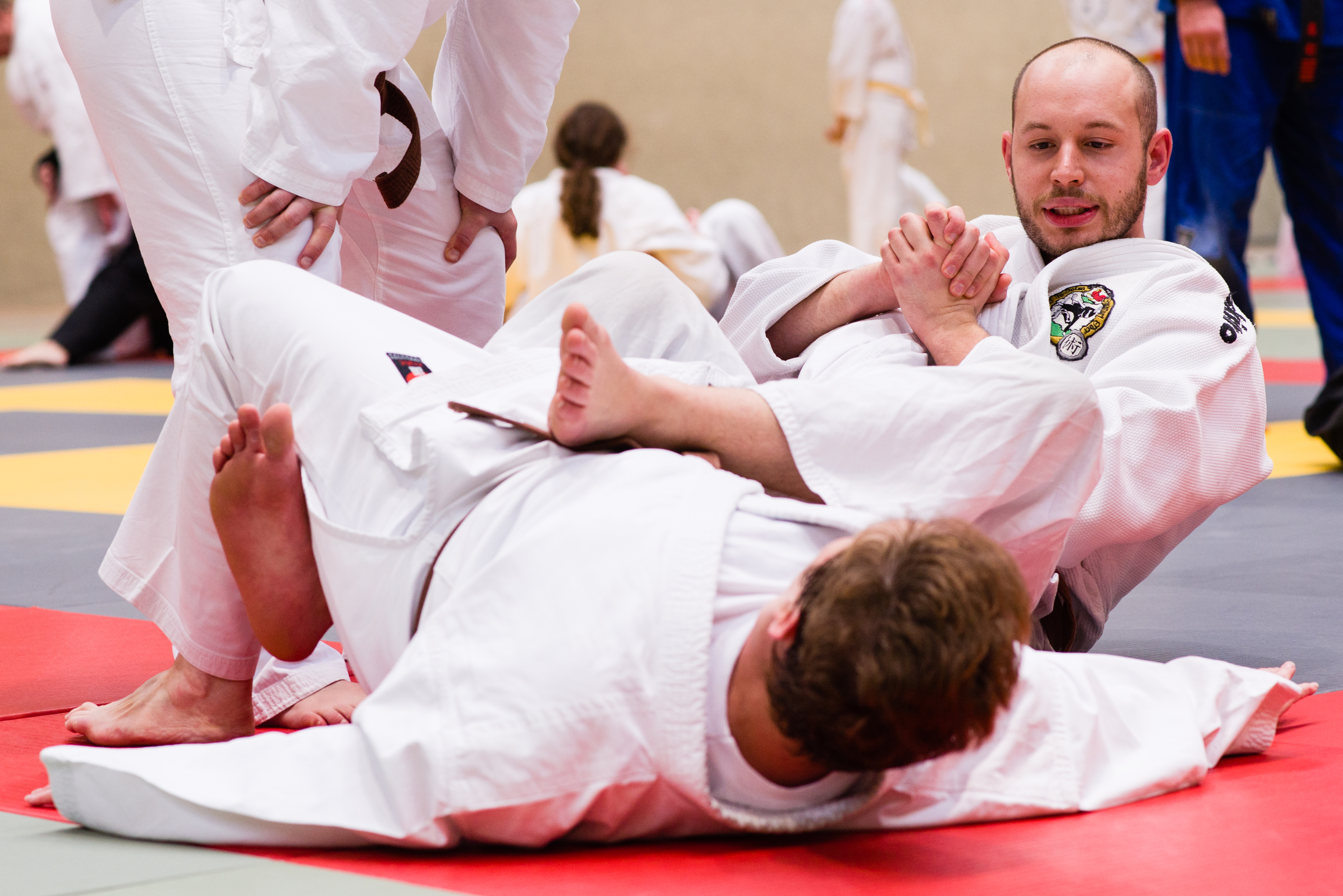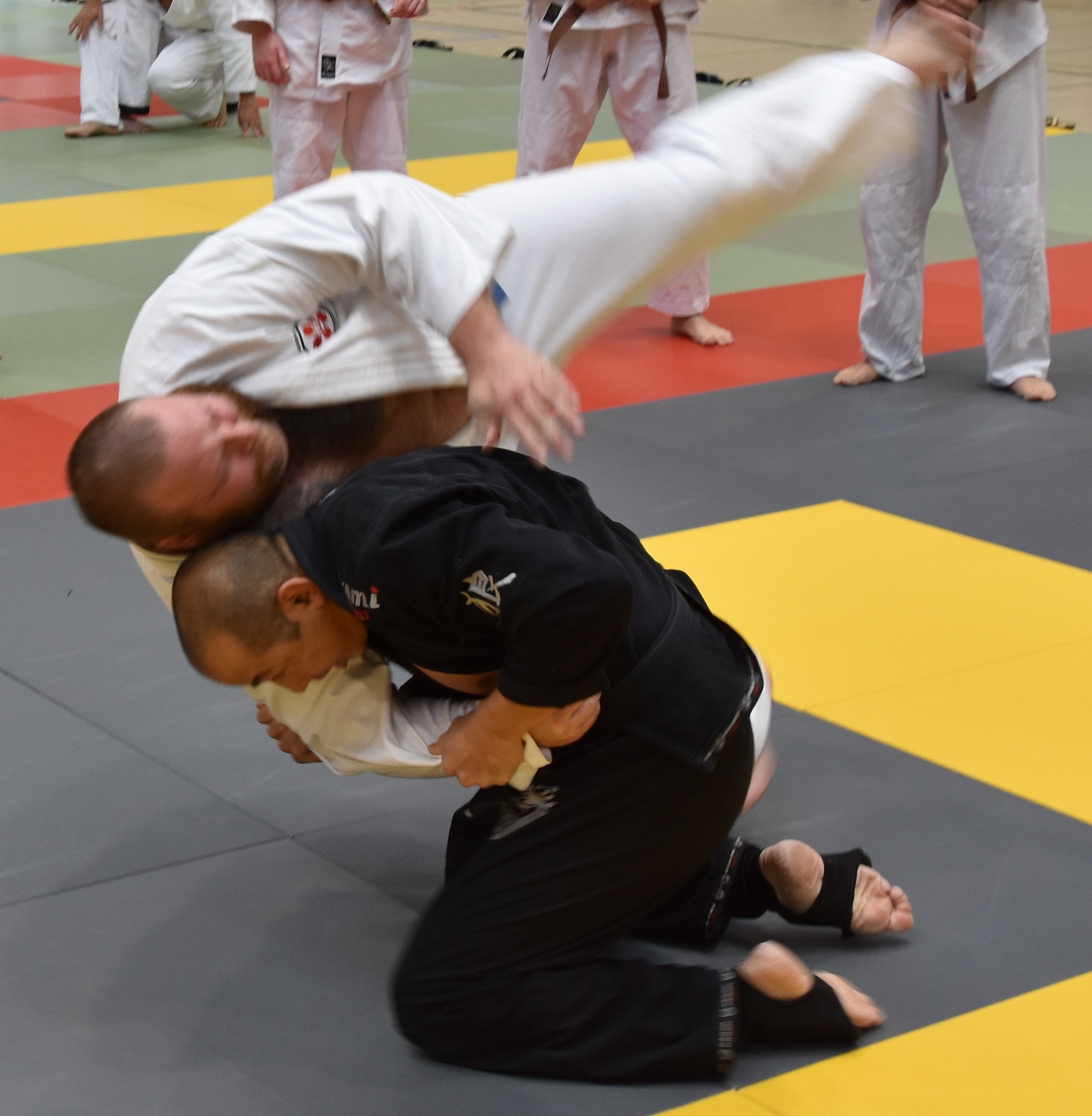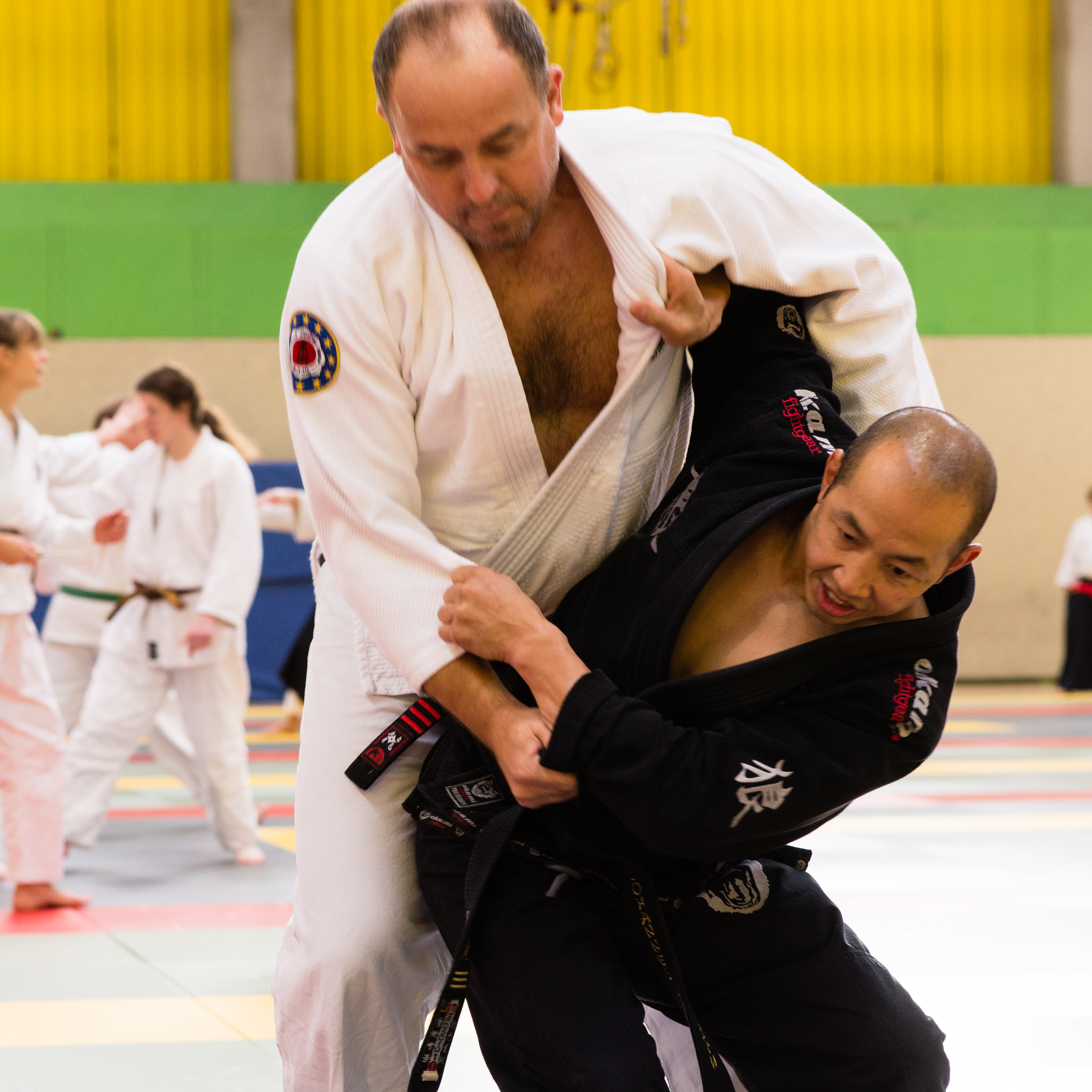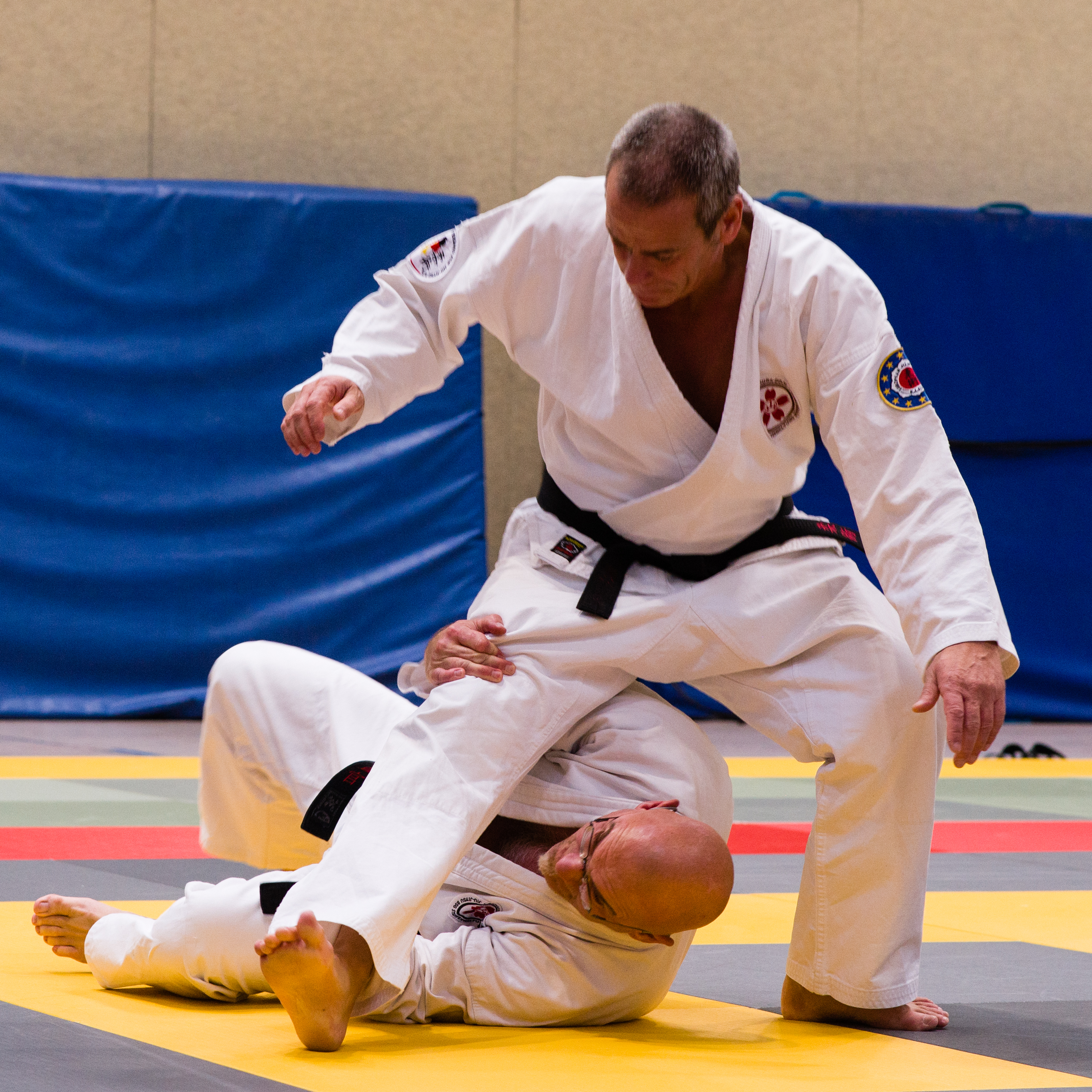 Vom 09. bis 11. November 2018 war es wieder soweit, das Sakura-Dojo lud bereits zum dreizehnten Mal zum internationalen Lehrgang der EJJU ein. Am frühen Freitagabend, die Tatami war bereits vollständig vorbereitet, fanden sich knapp dreißig Teilnehmer zum Workshop für Interessierte und nicht Budosportler ein. Unter Anleitung von Kalla Bergers und seinem Team erlernten diese kurze und effektive Techniken um sich in Gefahrensituationen zur Wehr setzen zu können. Zum Ende des Workshops hatten die Teilnehmer dann auch noch die Möglichkeitsich bei einem Angriff realistisch zu wehren, ein Meisterschüler musste in einen professionellen Schutzanzug einige Schläge und Tritte erleiden. Trotz der Ernsthaftigkeit des Themas bleib der Spaß nicht auf der Strecke, was die Bilder eindeutig beweisen.