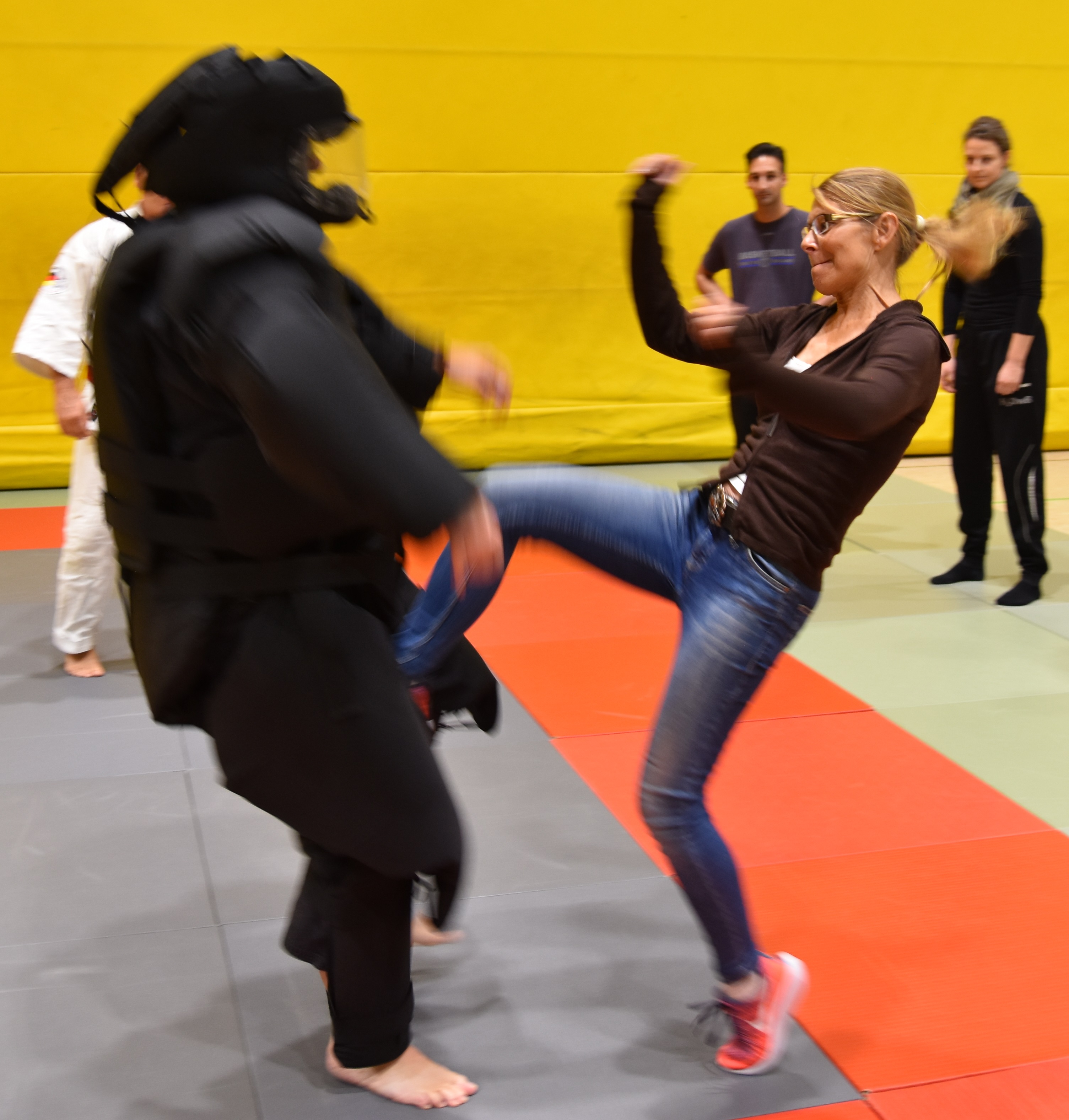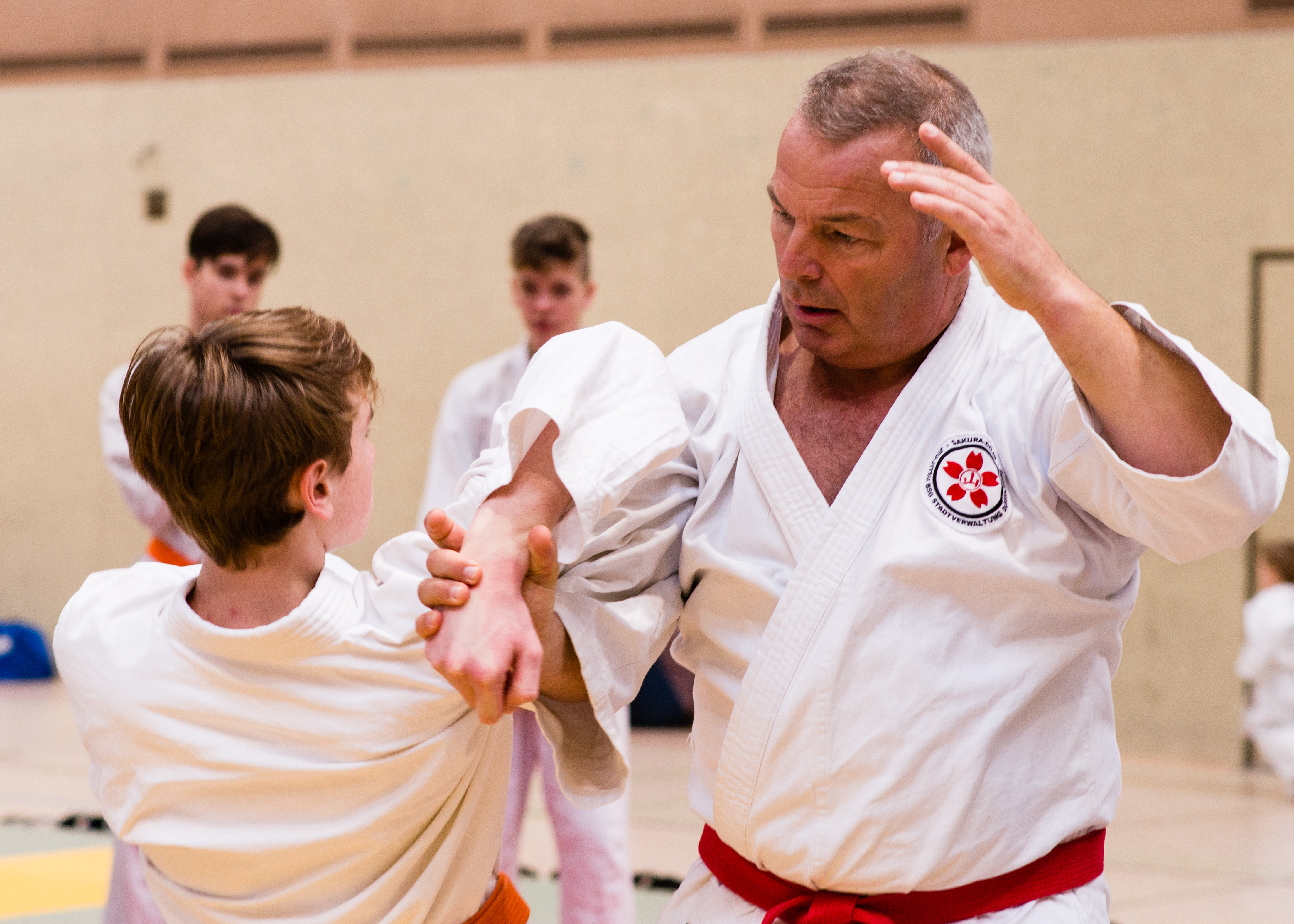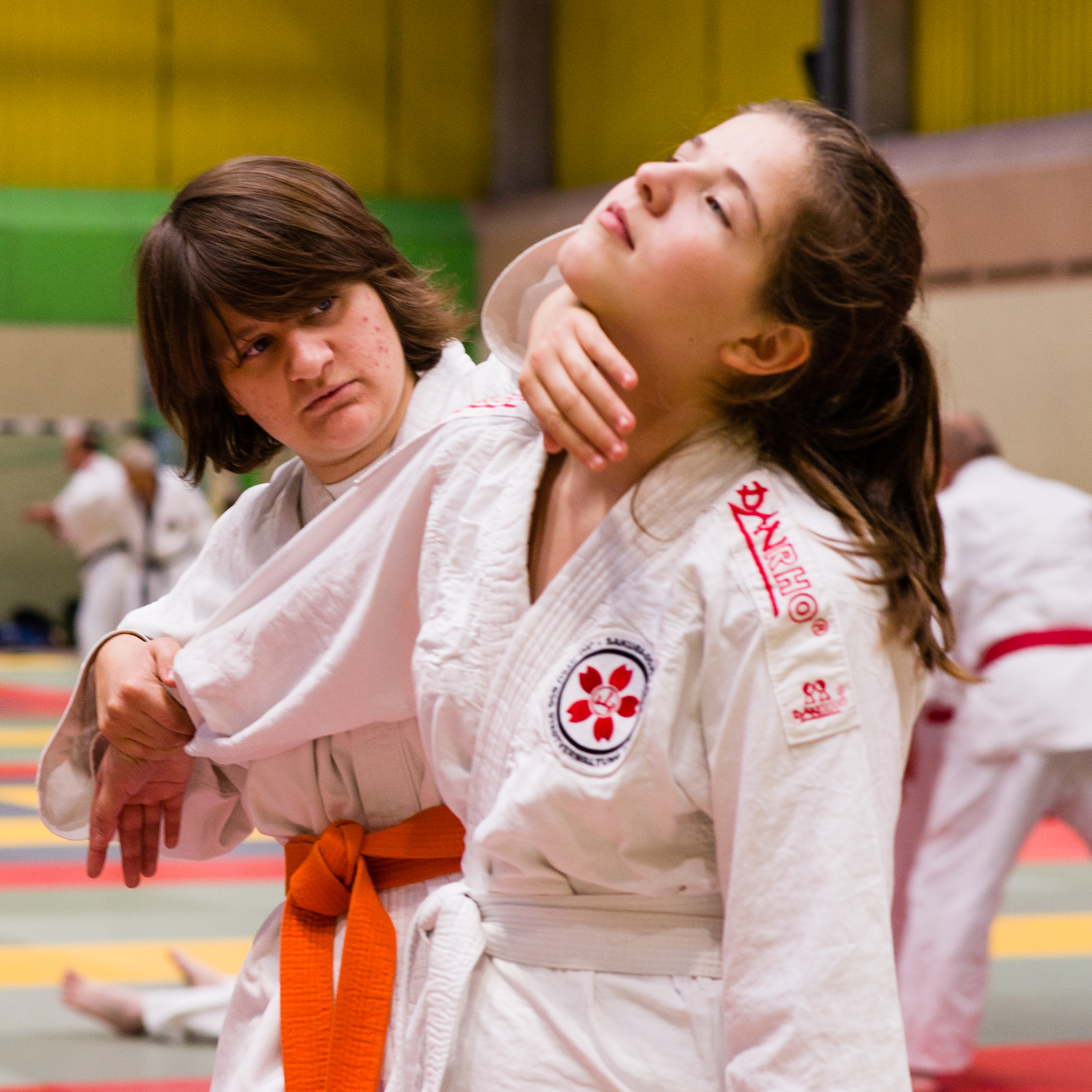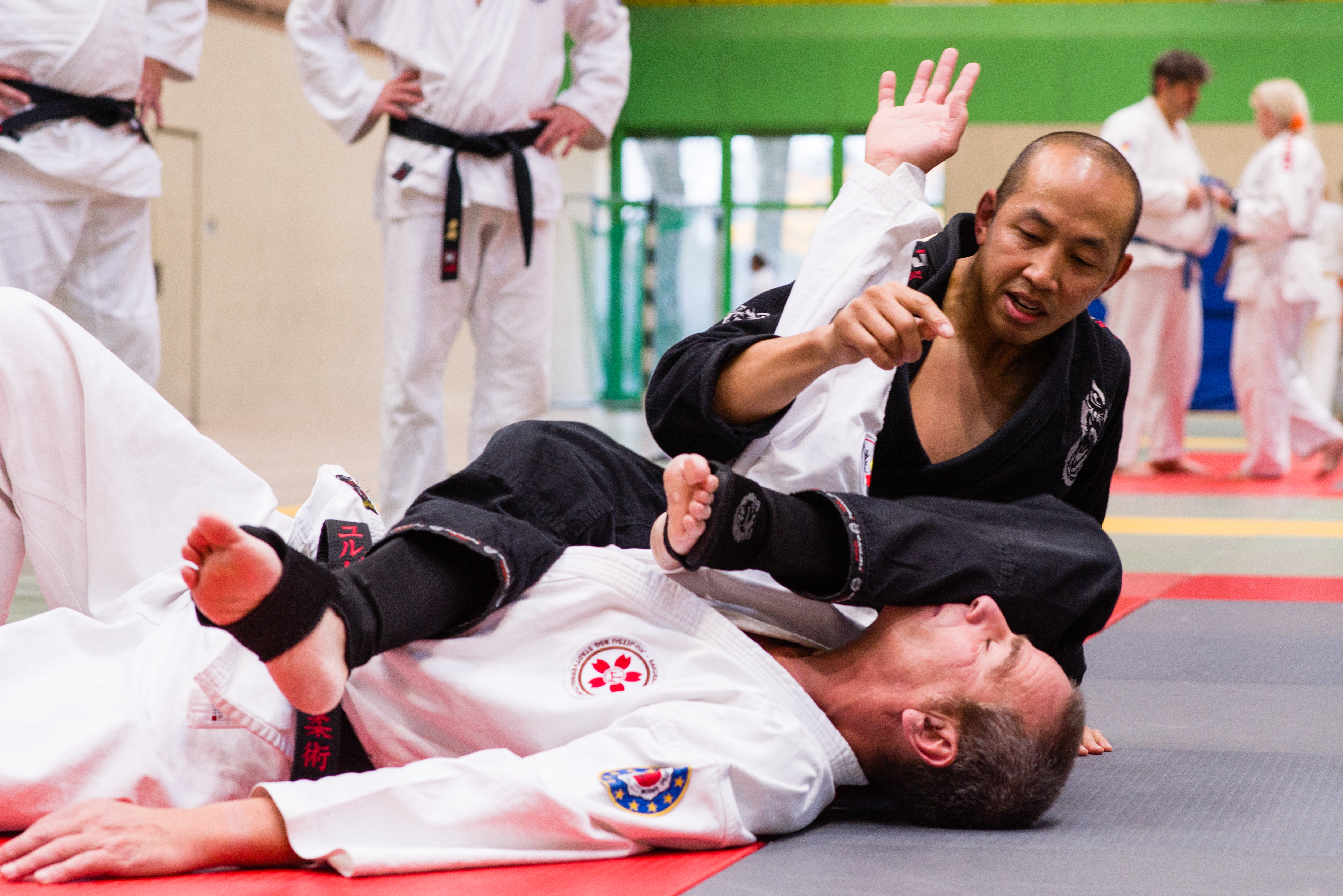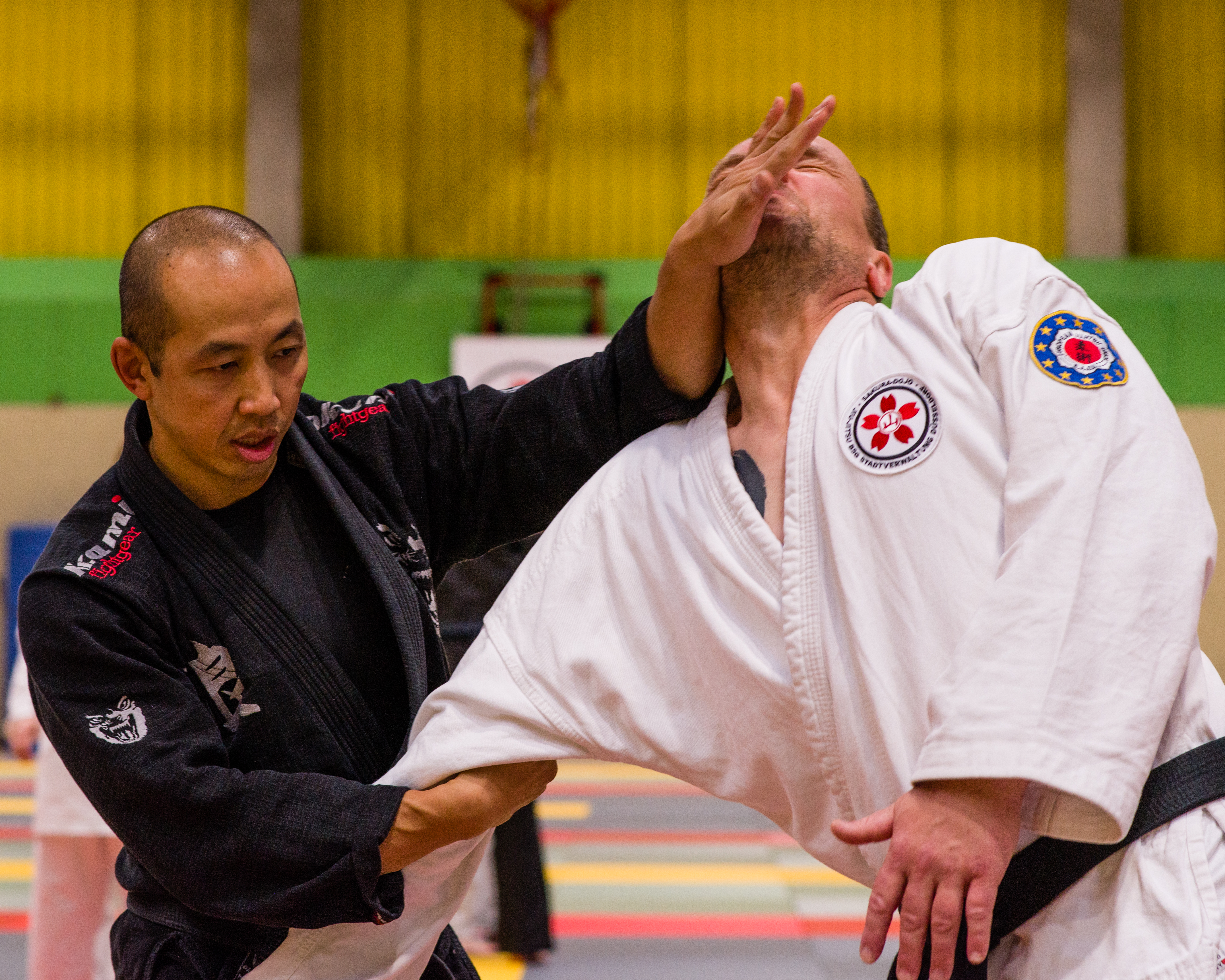 Vom 09. bis 11. November 2018 war es wieder soweit, das Sakura-Dojo lud bereits zum dreizehnten Mal zum internationalen Lehrgang der EJJU ein. Am frühen Freitagabend, die Tatami war bereits vollständig vorbereitet, fanden sich knapp dreißig Teilnehmer zum Workshop für Interessierte und nicht Budosportler ein. Unter Anleitung von Kalla Bergers und seinem Team erlernten diese kurze und effektive Techniken um sich in Gefahrensituationen zur Wehr setzen zu können. Zum Ende des Workshops hatten die Teilnehmer dann auch noch die Möglichkeitsich bei einem Angriff realistisch zu wehren, ein Meisterschüler musste in einen professionellen Schutzanzug einige Schläge und Tritte erleiden. Trotz der Ernsthaftigkeit des Themas bleib der Spaß nicht auf der Strecke, was die Bilder eindeutig beweisen.